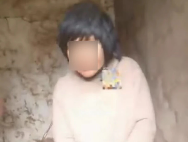 视频中,一女子精神失常,疑似被铁链拴在破屋里,口齿不清。