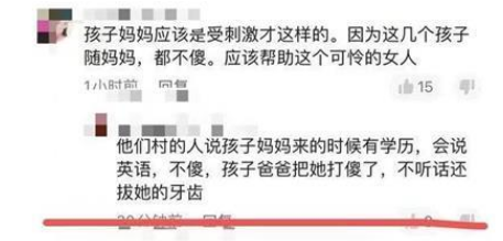 在该系列视频下方,疑似有同村人评论称,该女子刚到村里时还会说英语,不傻,精神正常,孩子爸爸把她打傻了,不听话还拔她的牙,是遭家暴后才成了视频中的样子。