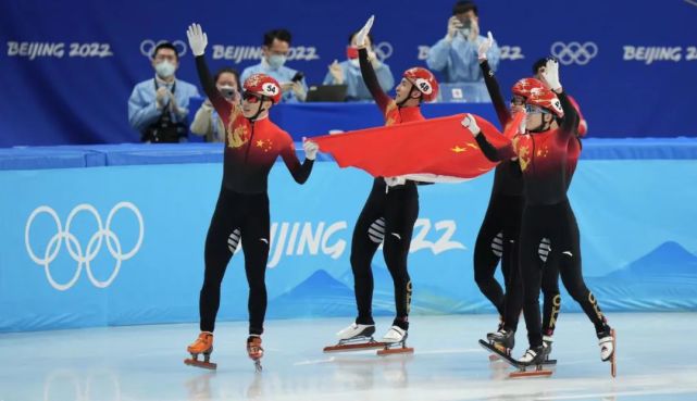 2月5日晚,在北京冬奥会短道速滑混合团体2000米接力A组决赛中,由范可新、曲春雨、武大靖、任子威组成的中国队率先撞线,为中国代表团夺得北京冬奥会首枚金牌。加上此前在半决赛中出场的张雨婷,中国队五名选手举着国旗挥手向观众致意,感谢观众支持,并和场边教练组的工作人员拥抱,分享夺冠喜悦。五名选手还举着国旗绕场与观众互动。