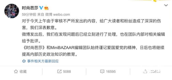 7月7日14时,时尚芭莎更新微博道歉:对于今天上午由于审核不严所发出的内容,给广大读者和粉丝造成了深深的伤害,我们深表歉意。
