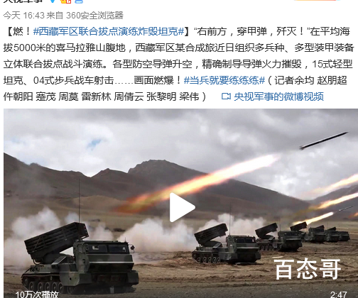 【燃!#西藏军区联合拔点演练炸毁坦克#】“右前方,穿甲弹,歼灭!”在平均海拔5000米的喜马拉雅山腹地,西藏军区某合成旅近日组织多兵种、多型装甲装备立体联合拔点战斗演练。各型防空导弹升空,精确制导导弹火力摧毁,15式轻型坦克、04式步兵战车射击……画面燃爆!#当兵就要练练练#